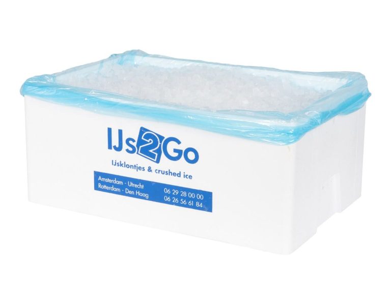 Een tempex doos met 20 kilo crushed ice. Dit crushed ice is dubbel frozen wat betekent dat het gemaakt is eerst weer wordt ingevroren en daarna pas verpakt. Hierdoor heb je mooi en los crushed ice wat perfect is voor jouw drank /cocktail of om mee te koelen.